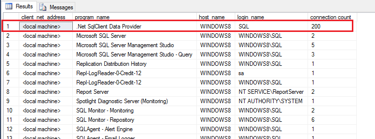 and if we run our query against the server to see how many connections we now see the 200 connections that the connection string script allowed and no error…
